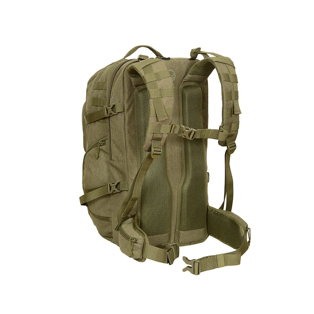 Repun ulkopuolisten pussien kiinnittäminen mahdollistuu MOLLE -hihnaston ansiosta. Hihnasto kulkee jokapuolella reppua, joten mahdollisuudet haluamasi lisäosien sijoitteluun ovat lähes rajattomat. Kokonaisuudessaan 42 litrainen tilaihme, jossa itsessään taskuja ja osastoja yhteensä 16kpl, paino 1,9kg.